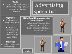On week 6 i made a DLO for a career i choosed after finishing a career quest. The career i picked was the job of a Advertising Specialist. I chose this career because of the money but not only the money i also wanted to see what it is like to plan, create, and manage advertising campains to promote products and services for clients so i really thought that this career would be intresting due to my intrest in planning and creating and for the money.